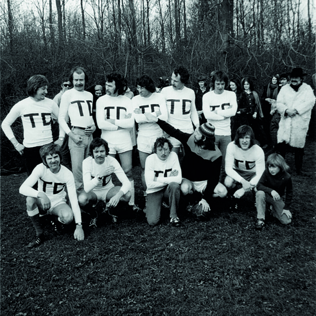 TD voetbalteam, staand tweede van links Hartmut Kowalke, helemaal rechts Benno Wissing met hoed, 1971